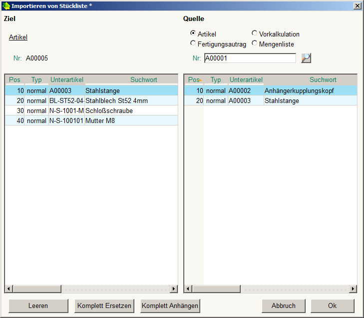 Sie können Arbeitsgänge/Stücklisten aus anderen Quellen importieren. Gehen Sie dazu in der Menüleiste unter [Bearbeiten] → [Optionen] → [Stkl/Arbg importieren]. Es öffnet sich ein Importfenster, links sehen die vorhandenen/zugeordneten Positionen und auf der rechten Seite befinden sich die Positionen aus der entsprechende Quelle.